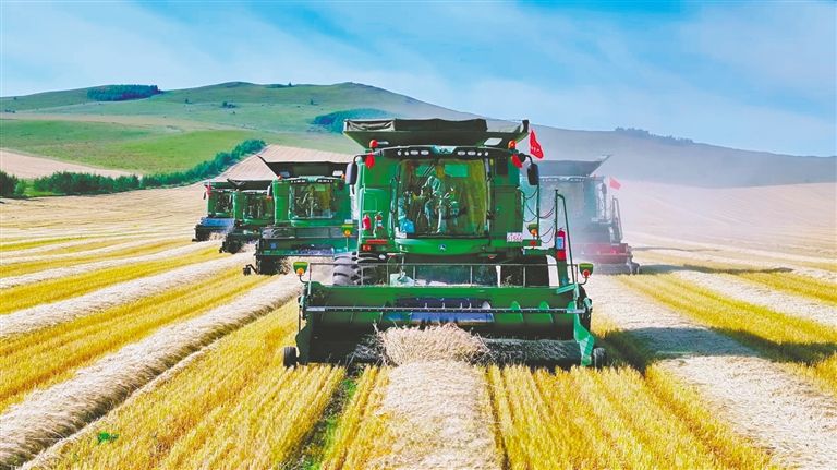 9月22日,聯合收割機在田間作業。金秋的額爾古納,百萬畝麥田在風中翻涌,呼倫貝爾農墾拉布大林農牧場有限公司120連(隊)的農墾人用豐收書寫著“屯墾戍邊”新答卷。草原云·內蒙古新聞網記者 李新軍 攝