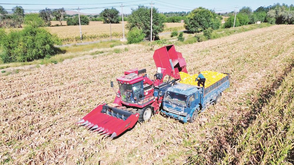 在烏達區烏蘭淖爾鎮,農機手駕駛收割機在農田里收割玉米。
