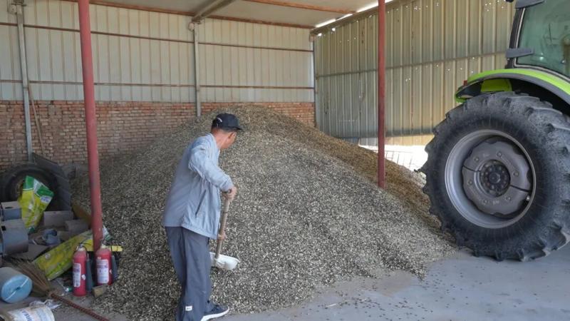 籽瓜渾身皆為寶,瓜肉不僅蘊含多種維生素和礦物質,具備降火敗毒、利尿去燥、止咳平喘的功效,而且其瓜子還可售賣獲利,是群眾心中實惠又健康的“養生瓜果”。在呼布其嘎查種植戶陳忠來家的院子里,水泥地上鋪滿了晾曬的籽瓜子,他正拿著鏟斗將曬干后的籽瓜子歸攏成堆,準備過篩去除雜質,為后續售賣做好準備。陳忠來一邊忙活一邊向記者介紹,今年種了一百多畝的籽瓜,顆粒比較飽滿,晾干后大約能收四萬多斤,剛收下來的濕瓜子得趕緊趁著天氣晴朗曬透,以防止發霉。