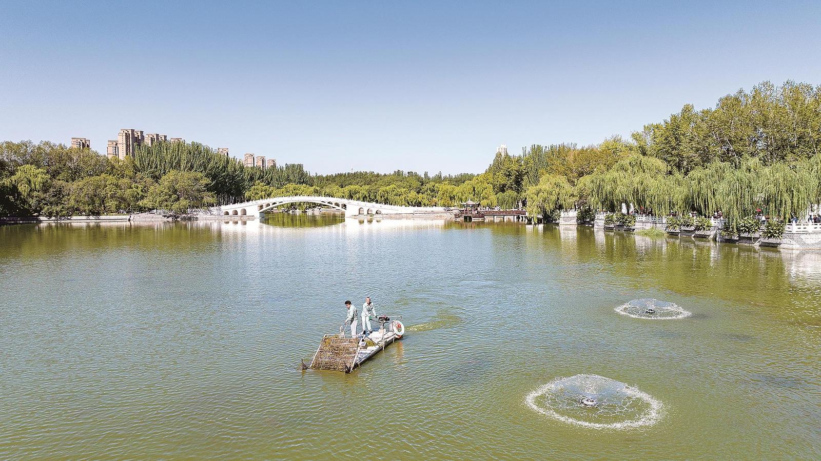 晨光里的勞動公園,工作人員正駕駛著小船穿梭于湖面間,俯身打撈水草等雜物。他們用日復一日的堅守,讓碧波常清、岸線常凈,更好地為市民和游人提供優質的服務。(李強)