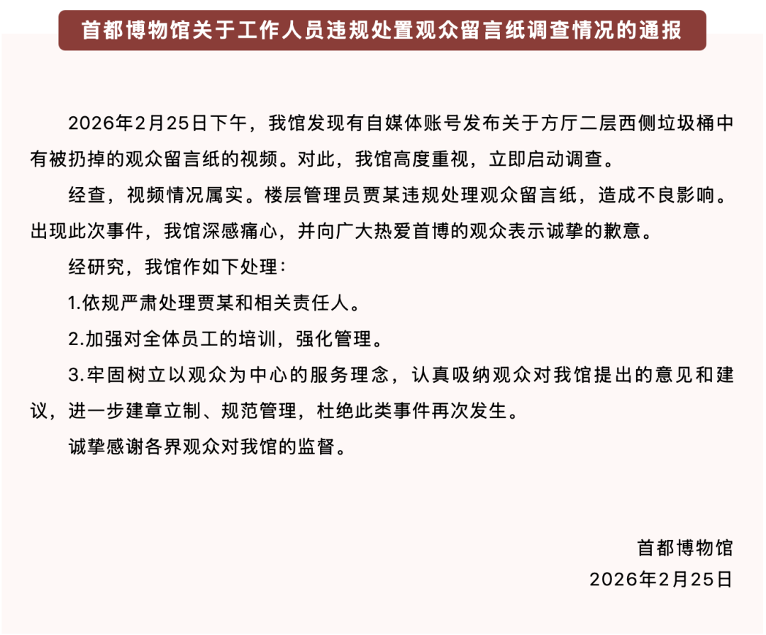 通報稱,2026年2月25日下午,首都博物館發現有自媒體賬號發布關于方廳二層西側垃圾桶中有被扔掉的觀眾留言紙的視頻。對此,首博高度重視,立即啟動調查。